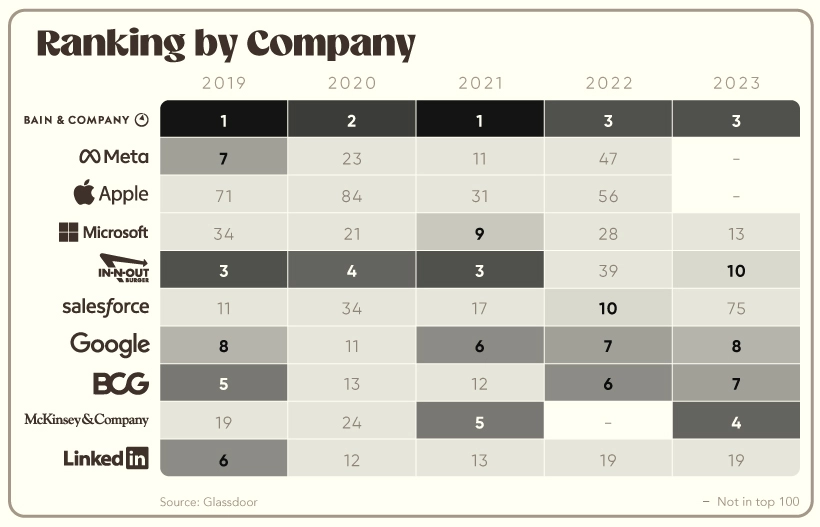 10,000명 이상의 직원을 보유한 경영 컨설팅 회사인 베인앤컴퍼니를 예로 들면, 지난 5년 동안 꾸준히 상위 3위에 랭크되어 있습니다. 또는 직원들이 익명으로 작성하는 Glassdoor 리뷰에서 지속적으로 좋은 급여와 스케줄 유연성에 대해 극찬하며 2015년부터 미국 내 상위 20개 고용주 중 하나로 선정된 패스트푸드 체인점 In-N-Out Burger를 살펴보십시오.