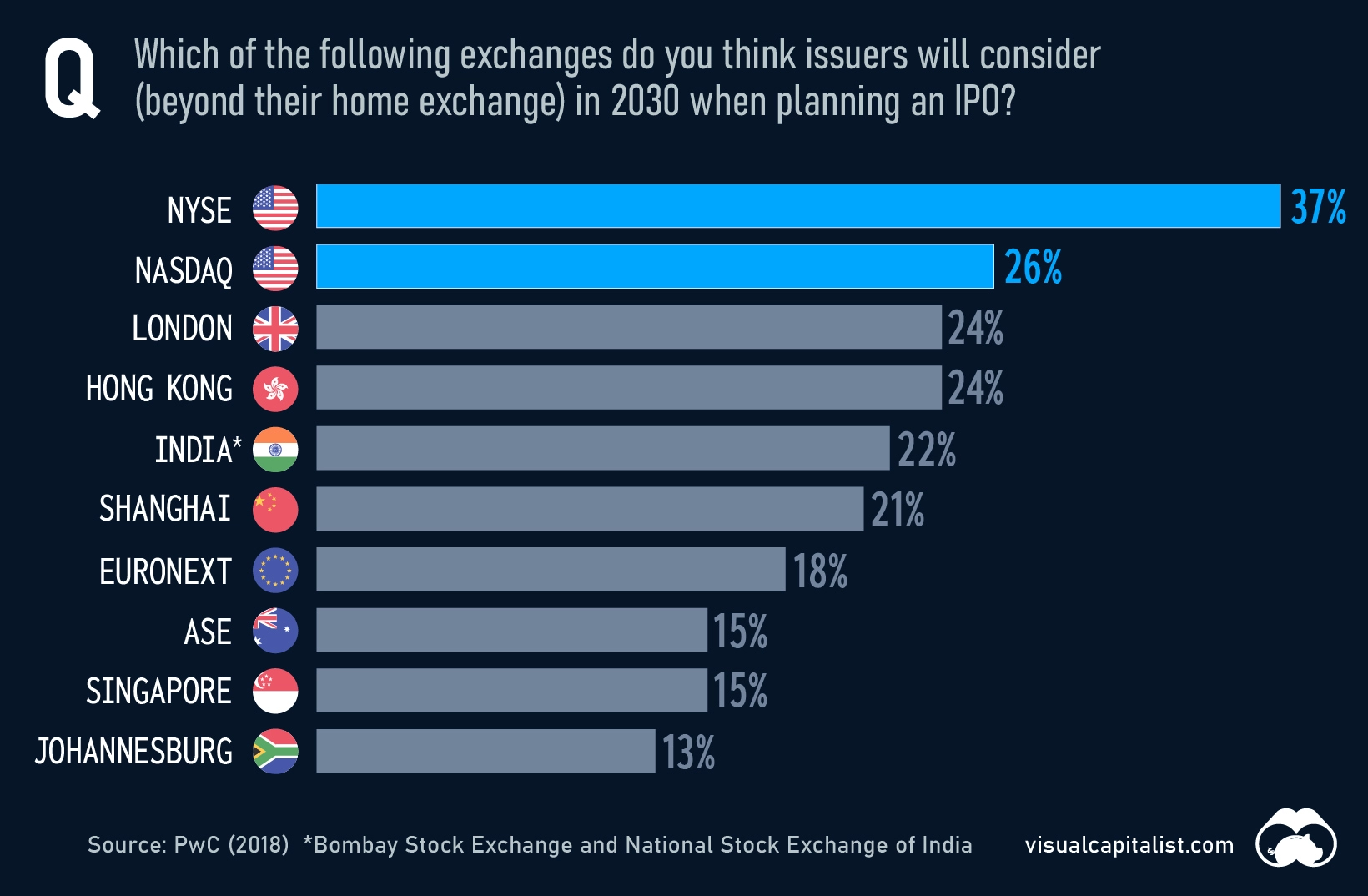 2018년 프라이스워터하우스쿠퍼스(PwC)는 수백 명의 자본시장 참여자를 대상으로 증권거래소의 미래에 대한 설문조사를 실시했습니다. 응답자들은 2030년에도 오늘날의 상위 거래소 중 상당수가 상장을 원하는 기업에게 여전히 인기 있는 선택지가 될 것이라고 답했습니다.