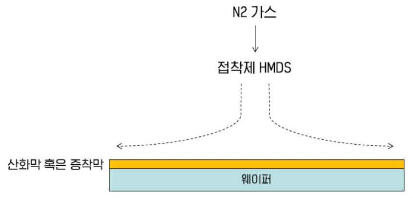 웨이퍼의 표면에 HMDS Gas 분사를 통하여 Si-O-H 형태의 친수성인 웨이퍼 표면을 소수성으로 바꾸어 주어