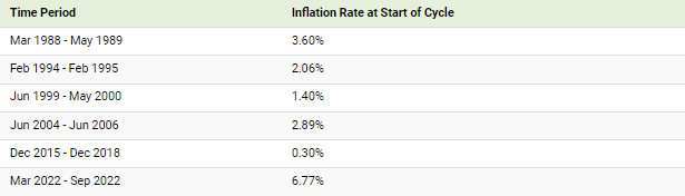 2022년 3월에 인상을 시작했을 때의 인플레이션은 지난 6번의 금리 인상 주기 중 가장 높았습니다.