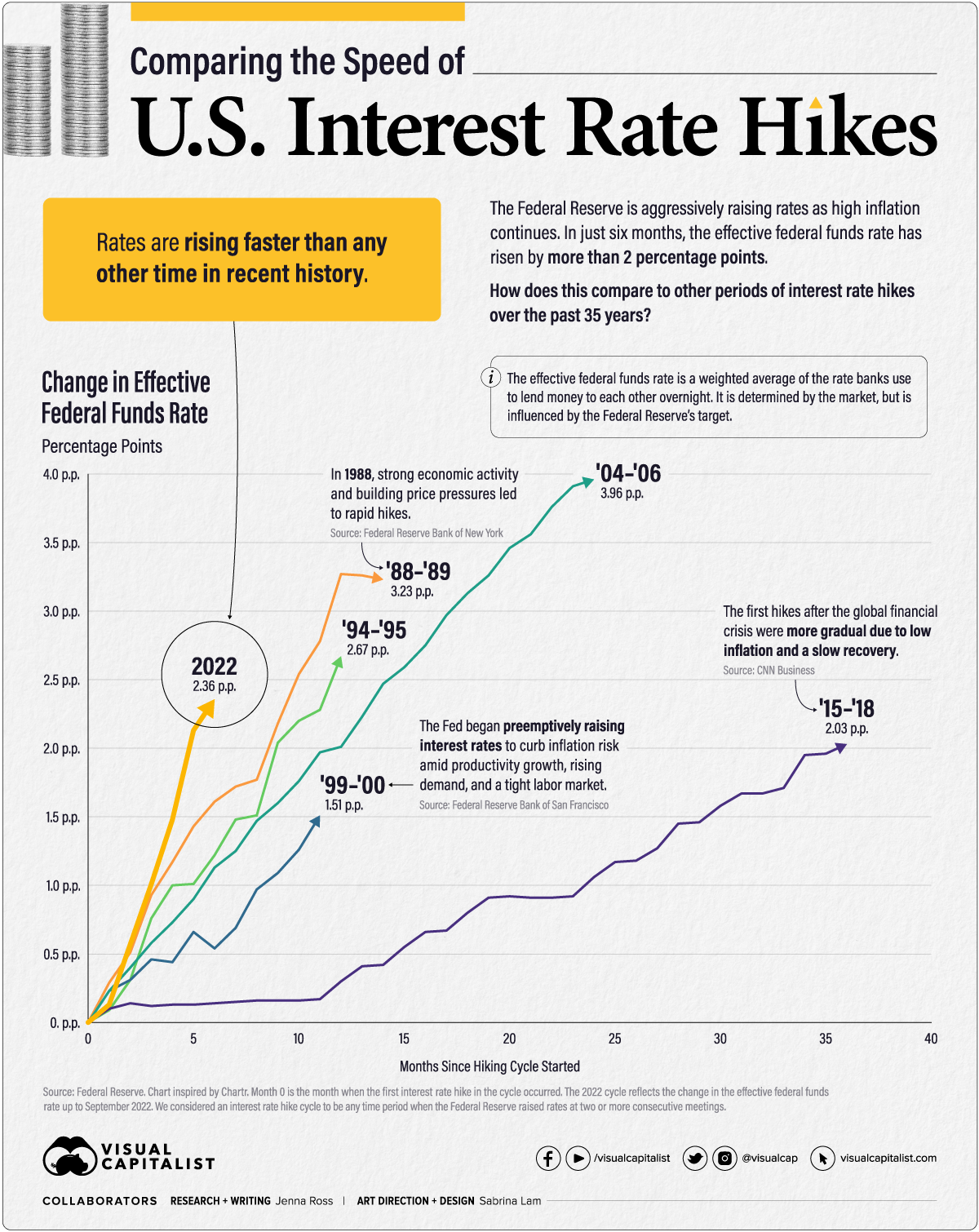 자료 출처: Visual Capitalist, "MARKETSComparing the Speed of U.S. Interest Rate Hikes (1988-2022)"