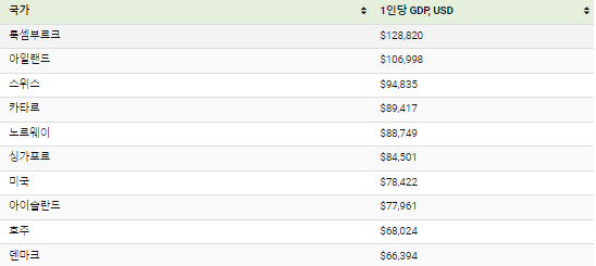 유럽연합에서 가장 작은 국가 중 하나인 룩셈부르크는 인구가 63만 4,000명이며 1인당 GDP가 13만 달러에 육박하는 이 순위에서 가장 부유한 국가입니다. 과거 철강 제조업으로 유명했던 룩셈부르크는 현재 경제 생산량의 대부분을 차지하는 대규모 금융 서비스 부문을 자랑합니다.