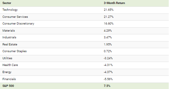 이러한 큰 움직임에 힘입어 기술 섹터는 3월 말 21.7% 상승하며 전체 섹터 지수 중 가장 좋은 성과를 기록했습니다.