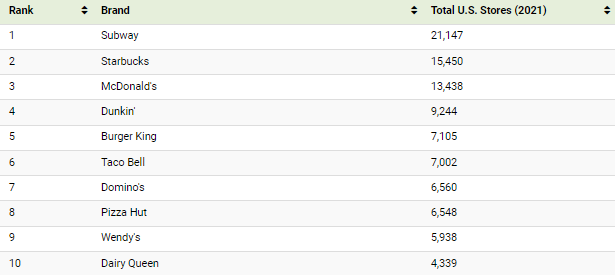 스타벅스와 서브웨이보다 매장 수가 적지만 2021년 매출은 460억 달러로 서브웨이와 스타벅스를 합친 것보다 많습니다.
