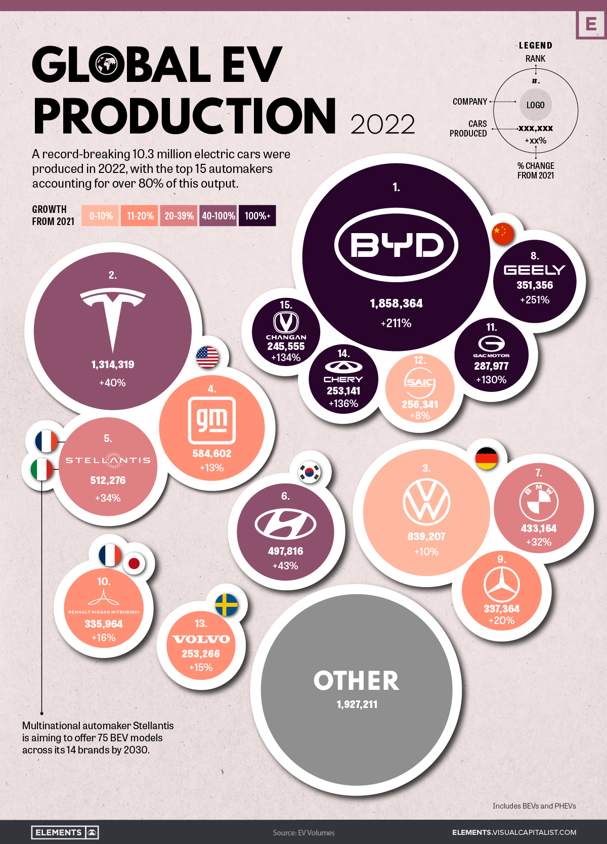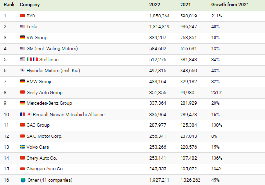 테슬라는 2022년에 생산량을 40%나 늘려 폭스바겐(+10%)과 GM(+13%)과 같은 서구 브랜드보다 앞서지만, 지리(+251%)와 같은 중국 경쟁사에는 뒤쳐져 있습니다.