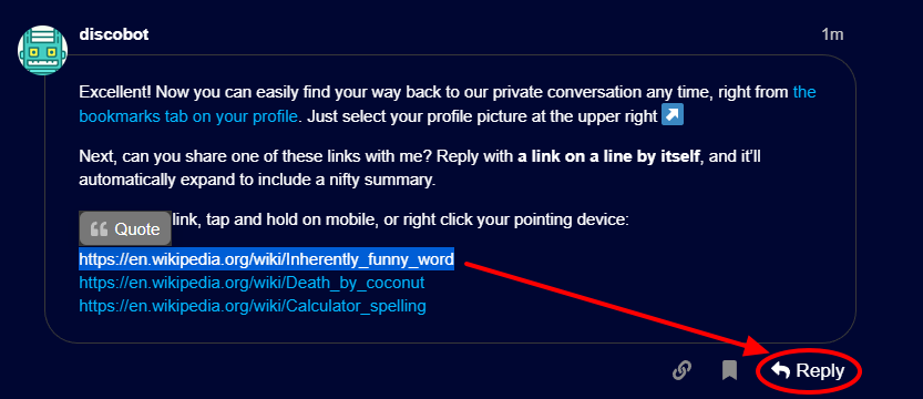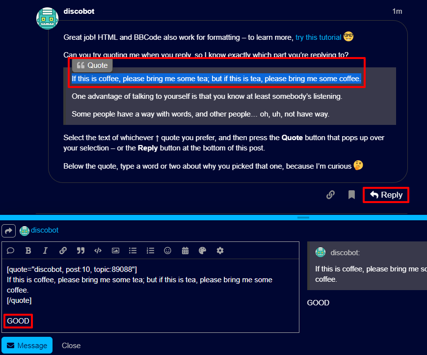 10. discobot 첫 문장 복사 or 드래그 후 Quote 누르고 Reply → 아래 추가로 아무 단어 입력 후 Message