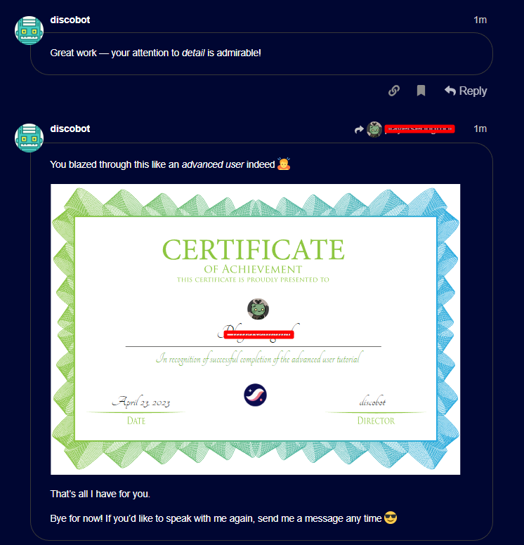 1. 인증서 받은 글에 이어서 Reply 클릭 → @discobot display help 입력