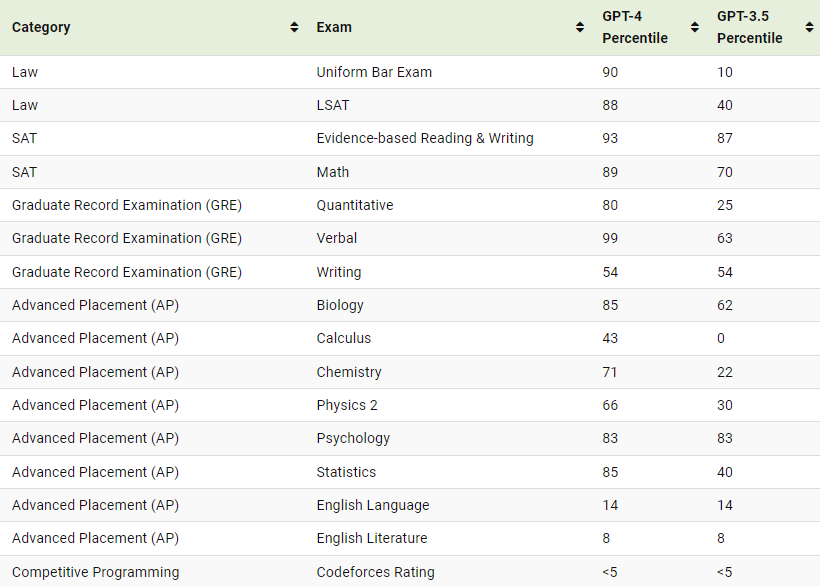 ChatGPT의 기능을 벤치마킹하기 위해 OpenAI는 다양한 전문 및 학업 시험의 시뮬레이션 테스트를 실행했습니다. 여기에는 SAT, 변호사 시험, 다양한 AP(Advanced Placement) 파이널이 포함됩니다.