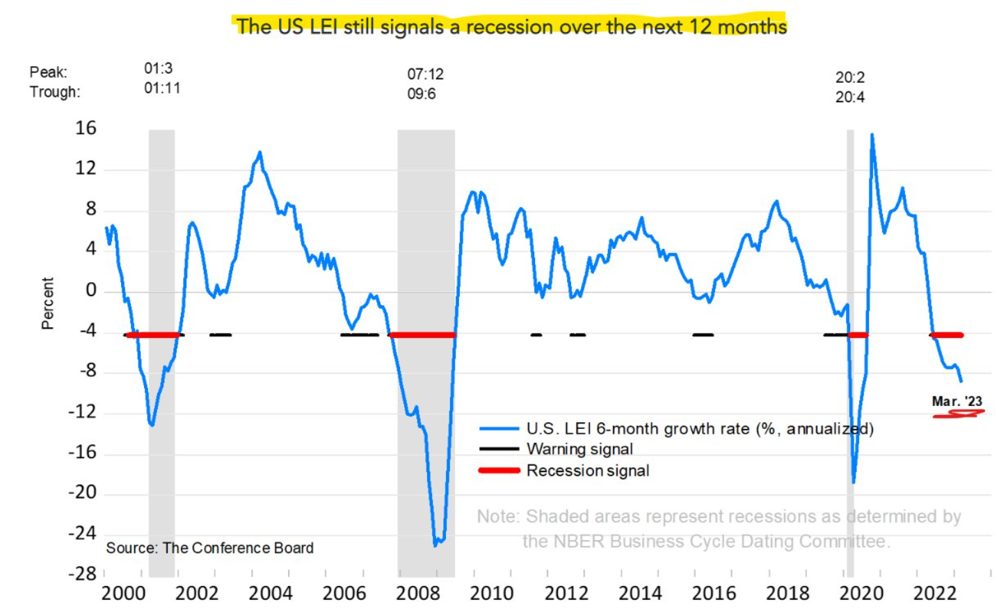 Conference Board의 경기선행지수(LEI) 지수는 3월에 추가 하락세를 보였습니다.
