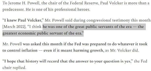 게다가 볼커는 파월 의장에게도 큰 영향을 끼친 것으로 보입니다. 파월은 여러 차례 볼커와 그의 통화 정책 접근 방식을 높이 평가했습니다. 다음은 뉴욕타임스의 제아나 스미알렉이 쓴 몇 가지 예시입니다: