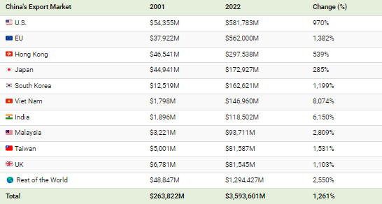 그렇다면 이러한 상품 수출의 대부분을 차지하는 국가는 어디일까요? 2022년 중국의 주요 수출 시장과 2001년 이후 변화는 다음과 같습니다: