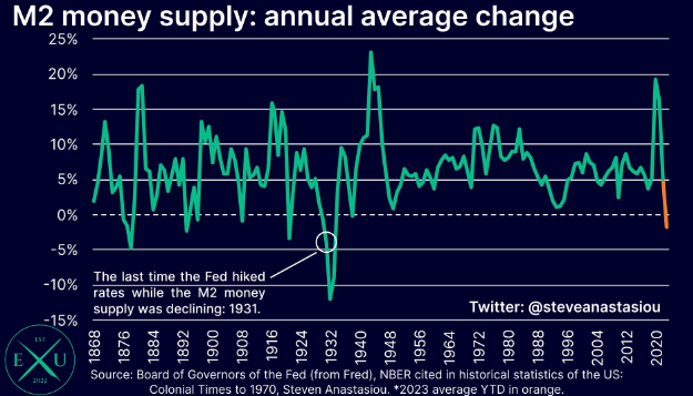 이로 인해 연준이 너무 오랫동안 양적완화와 ZIRP를 유지하게 된 것처럼, 이제는 대공황 이후 M2 통화 공급이 감소하는 동안 연준이 금리를 인상한 적이 없는 만큼 통화 정책을 상당히 긴축하는 결과를 초래하고 있습니다.