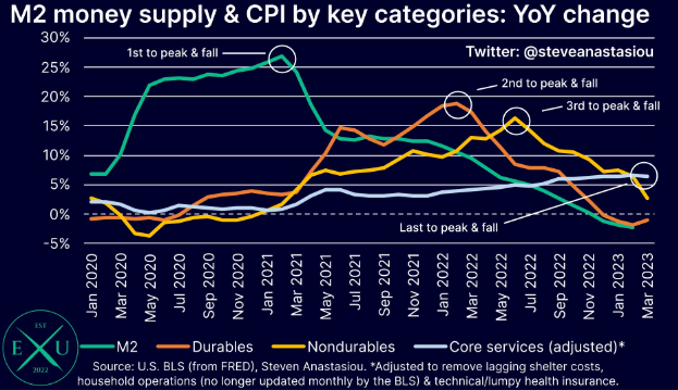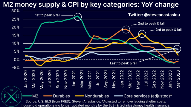 따라서 서비스 물가는 기저 인플레이션이나 "고착화된" 가격 압력을 더 잘 측정할 수 있는 지표가 아니라 M2 통화 공급, 내구재 및 비내구재 가격에 이미 일어난 일을 뒤늦게 반영하는 것입니다.