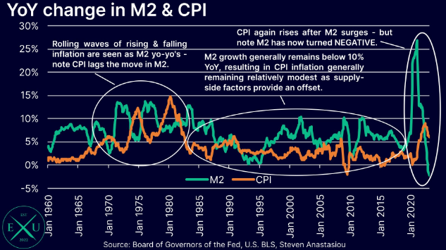 M2가 급증하면 경제 활동의 인위적인 호황과 높은 인플레이션이 발생했던 것처럼, M2가 감소하면 경기 침체와 물가 하락이 촉진됩니다.