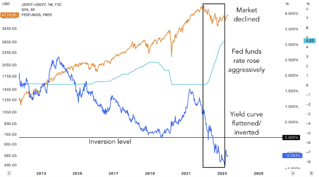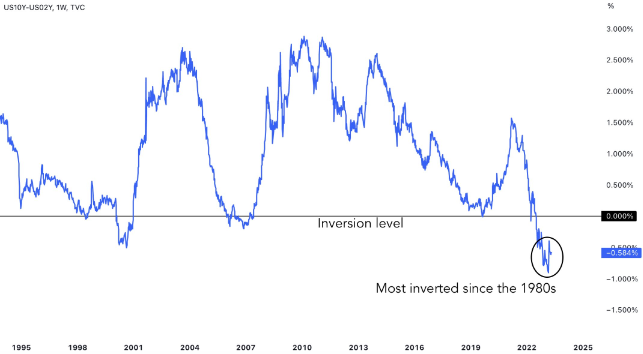 2022/2023년 10년물 마이너스 2년물 수익률 곡선은 1980년대 이후 가장 큰 역전폭을 보였습니다.