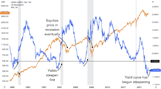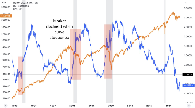 지난 세 차례의 주요 하락장은 수익률 곡선이 가파르게 상승하는 동안 발생했습니다: