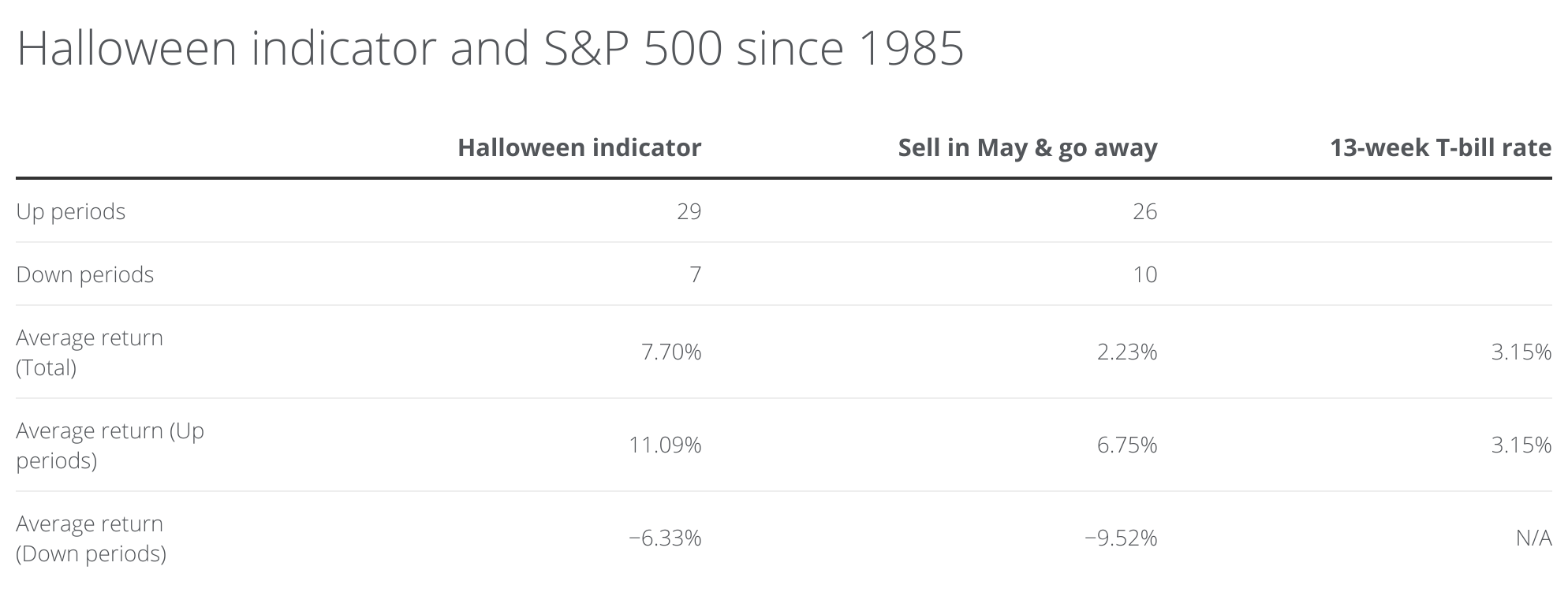 투자자가 11월 첫 거래일에 S&P 500 지수를 매수하고 4월 마지막 거래일에 매도한 후 나머지 6개월 동안 13주짜리 양도성예금증서에 투자했다면 연평균 수익률은 10.85%입니다. 전액 투자를 유지했다면 연평균 수익률은 9.93%였을 것입니다.
