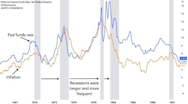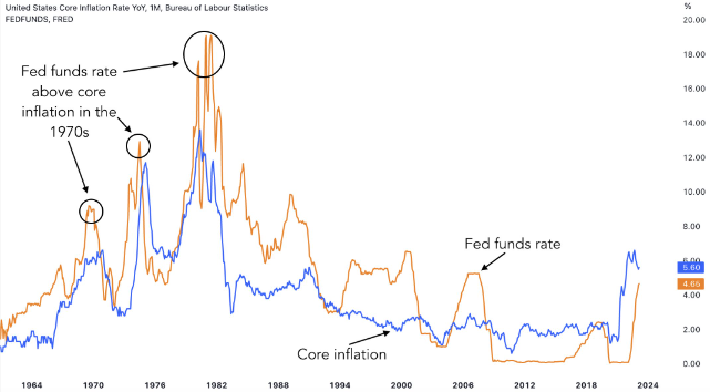 1970년대 하이 인플레이션 시대에 관찰된 바와 같이 미국 중앙은행은 장기간에 걸쳐 핵심 인플레이션보다 높은 연방기금 금리를 유지하여 인플레이션을 통제하는 것을 목표로 합니다.