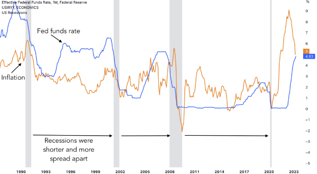 낮은 금리는 낮은 인플레이션으로 인해 연준이 개입할 수 있기 때문에 경기 침체가 덜 심각하고 덜 빈번하게 발생했습니다.