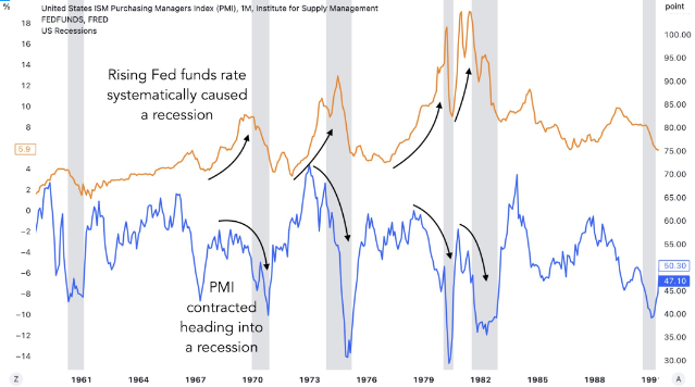 그 수십 년 동안 연준의 기준금리 인상은 급격한 PMI 위축을 동반한 경기 침체를 체계적으로 야기했습니다.