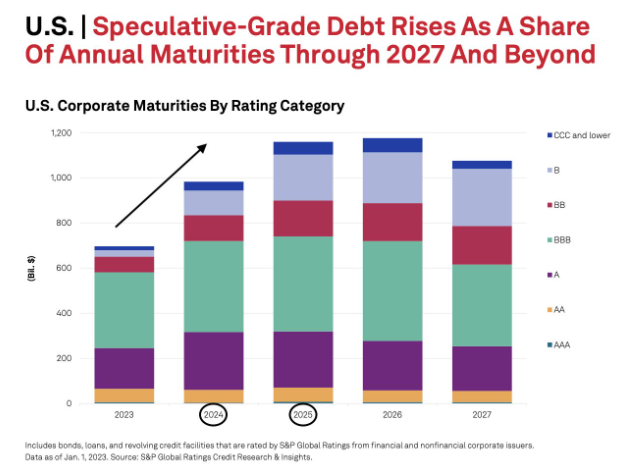 S&P Global Ratings report 에서는 수익성이 낮은 많은 기업이 곧 부채 만기 문제에 직면할 것이라고 강조합니다.