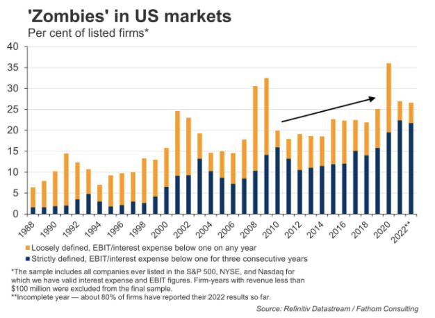 부채 갱신 비용이 크게 증가함에 따라 고금리는 '좀비' 기업에게 큰 도전 과제입니다.