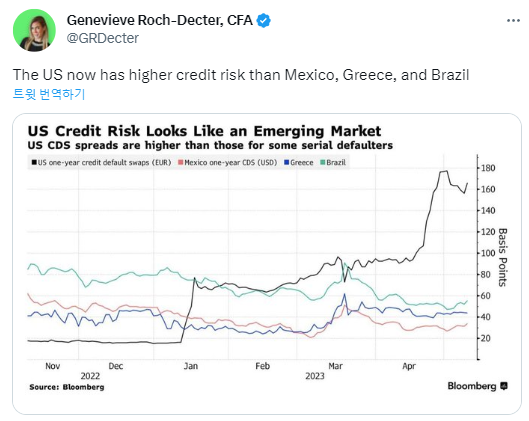 아래 차트에서 볼 수 있듯이 미국의 1년 신용부도스왑(CDS) 스프레드는 다른 국가에 비해 훨씬 높습니다.