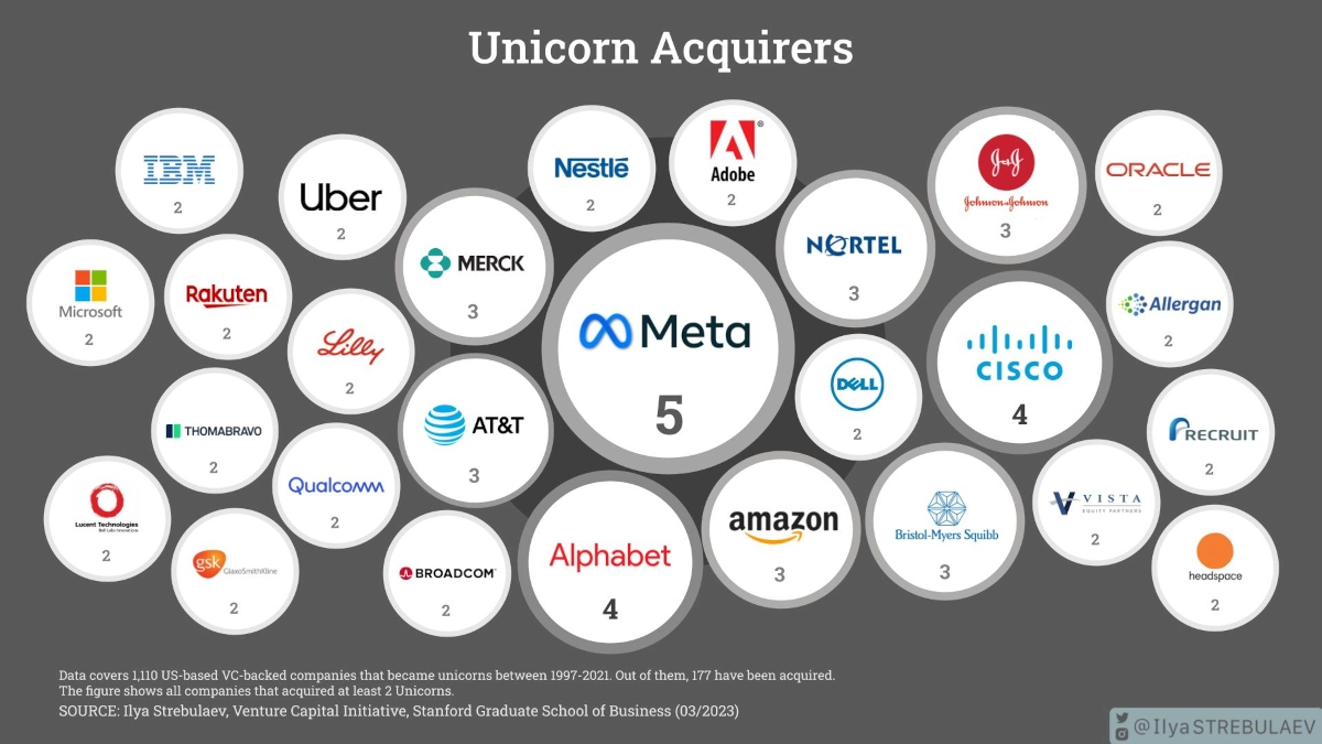 한편, 인수 기업의 56%는 비상장 기업이었을 때 자체적으로 벤처 캐피탈의 투자를 받았습니다. 여기에는 메타, Cisco, 알파벳, 아마존과 같은 팩 리더들이 포함됩니다.