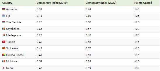감비아는 민주주의가 가장 많이 개선된 상위 10개 국가에 포함된 아프리카 5개국 중 하나였습니다.