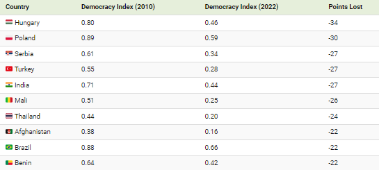 중앙 및 동유럽은 민주주의가 가장 크게 후퇴한 국가 중 세 곳이 위치한 곳입니다.