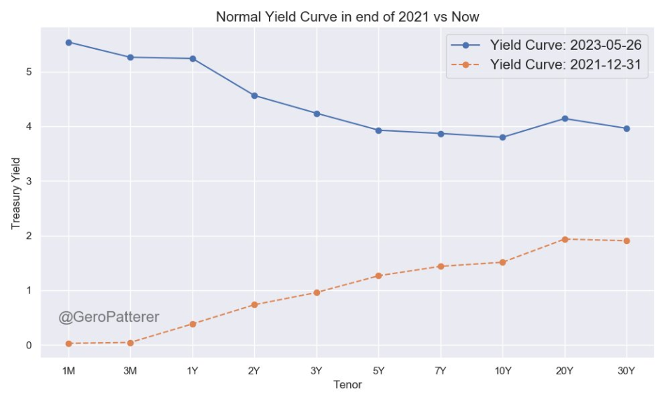 이제 금리역전(수익률 곡선)은 다음과 같이 보입니다(파란색).