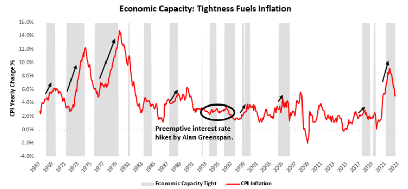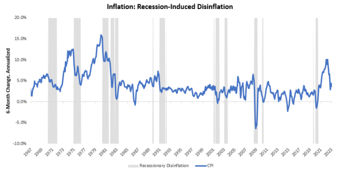 5. 이러한 타이트한 경제 여력은 일반적으로 경기 침체를 통해서만 생산, 고용 및 명목 지출을 줄임으로써 완화될 수 있습니다. 아래에서는 고용, 생산, 명목 지출을 합친 지표의 지속적인 감소가 디스인플레이션을 촉진하는 방법을 보여줍니다: