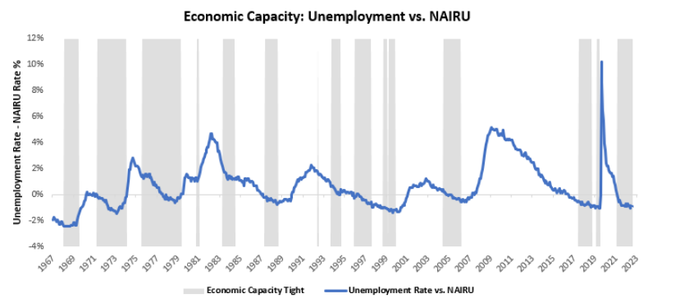 11. 오늘날 생산과 기업 매출은 약화되기 시작했지만 노동 시장 데이터는 여전히 견고합니다. 아래에서는 지속 가능한 실업률(NAIRU) 지표와 비교하여 노동시장이 얼마나 타이트하게 유지되고 있는지 보여줍니다.