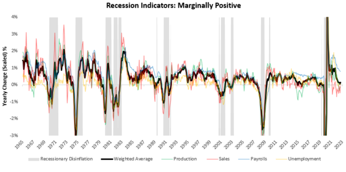 9. 이 접근 방식은 NBER의 경기침체 날짜를 사용하는 것과 동일하지만 실시간으로 사용할 수 있다는 장점이 있으며 NBER의 경기침체 날짜 위원회와 관련된 재량권을 피할 수 있습니다. 아래에는 이러한 경기 침체 지표의 가중 평균이 표시되어 있습니다:
