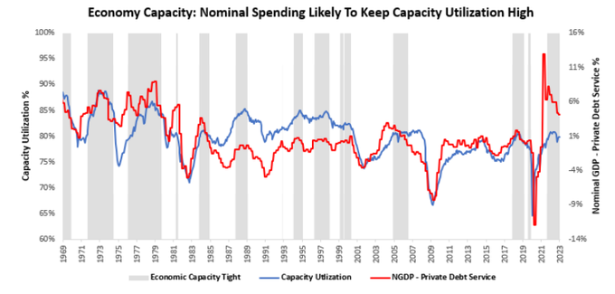 13. 또한, 부채 상환 부담 대비 생산능력 활용률과 명목 GDP는 모두 높은 수준을 유지하고 있습니다. 아래에서 볼 수 있듯이 생산능력 가동률은 소폭 둔화되었지만, 여전히 매우 높은 수준의 명목 지출이 이를 뒷받침하고 있습니다.
