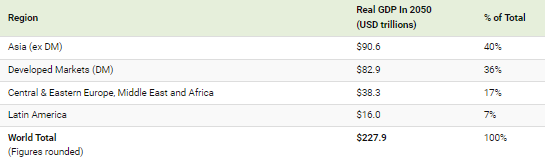 이러한 전망에 따르면 아시아(구 개발도상국)가 전 세계 GDP의 40%를 차지할 것으로 예상되며, 이는 선진 시장의 예상 점유율인 36%보다 약간 앞서는 수치입니다. 이는 50년 전(2000년) 선진국이 전 세계 GDP의 77% 이상을 차지했던 것과는 큰 변화입니다.