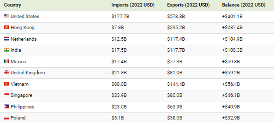 이러한 무역 흑자는 특히 미국과 인도를 포함한 세계 최대 경제 대국과의 무역 관계에서 두드러지는데,