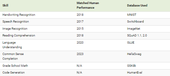 아래는 8개 기술 모두에서 AI가 인간의 성과와 일치하기 시작한 시점을 나타낸 표입니다.