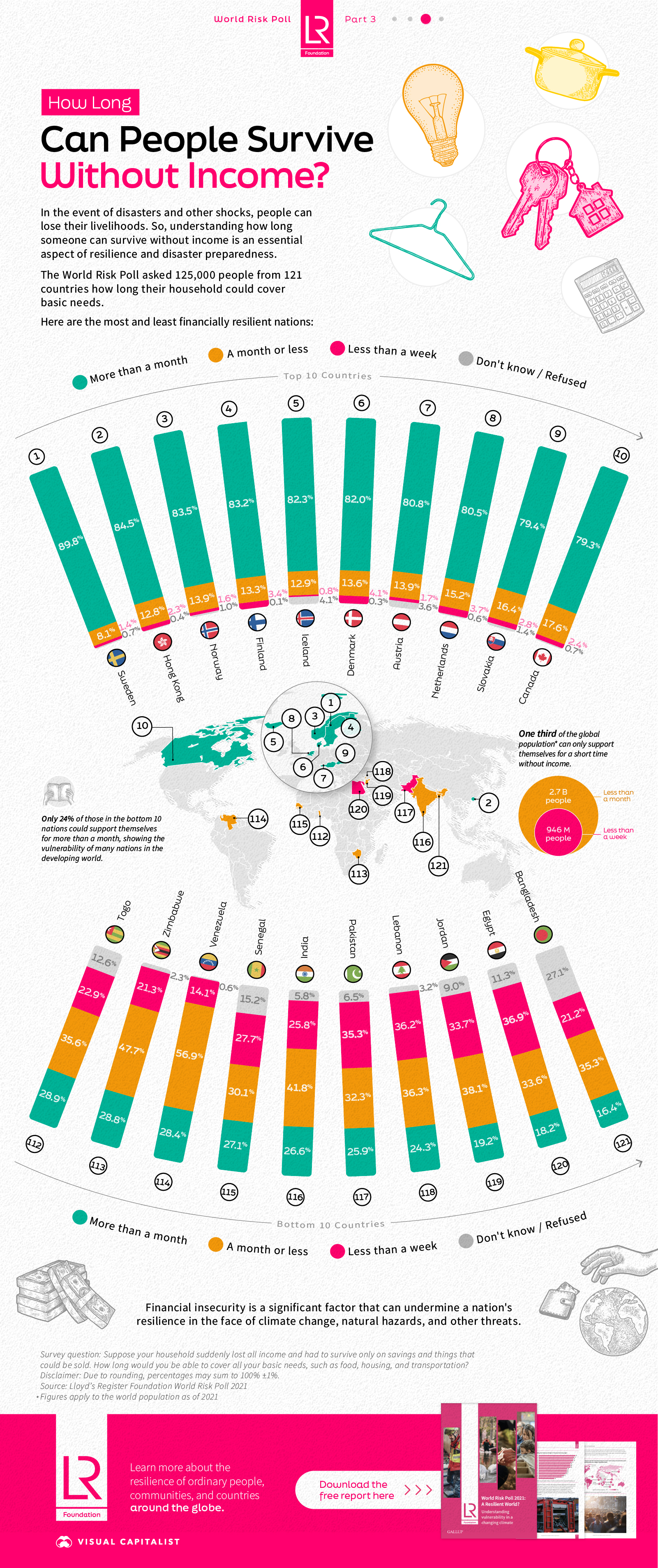 2021년, 로이드 선급재단은 갤럽과 협력하여 121개국 125,000명을 대상으로 소득 없이도 기본적인 필요를 얼마나 오래 충족할 수 있는지에 대해 설문조사를 실시했습니다. 응답은 한 달 이상, 한 달 이하, 일주일 이하, 모름/무응답으로 분류하여 한 달 이상 생존할 수 있다고 응답한 사람, 한 달 미만 생존할 수 있다고 응답한 사람, 한 달 미만 생존할 수 없다고 응답한 사람으로 분류했습니다.