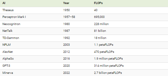 예를 들어, 복잡한 수학 문제를 풀 수 있는 AI인 미네르바를 훈련시키는 데 사용된 컴퓨팅은 10년 전 AlexNet을 훈련시키는 데 사용된 컴퓨팅의 거의 600만 배에 달합니다.
