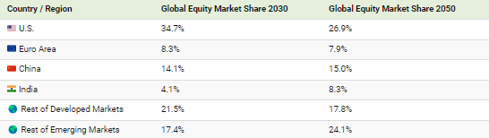 2050년에는 신흥 시장의 비중이 미국을 훨씬 뛰어넘어 전 세계 주식 시장의 47%까지 상승할 것으로 예상됩니다.