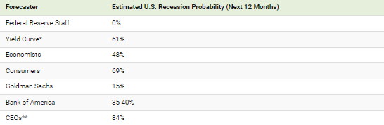 연준 직원들이 계속해서 밝은 전망을 내놓고 있지만, 10년 만기 국채 금리와 3개월 만기 국채 금리 사이의 수익률 곡선을 보면 향후 12개월 내에 경기 침체가 발생할 확률이 61%에 달하는 것으로 나타났습니다. 역사적으로 수익률 곡선은 1959~2009년 데이터를 사용하는 뉴욕 연준 모델을 기반으로 경기 침체를 예측하는 신뢰할 수 있는 지표였습니다.