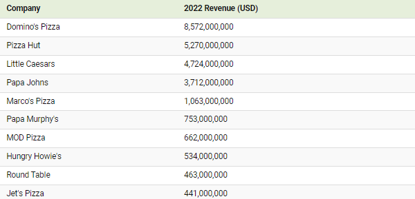 이 그래픽은 2022년 매출 수치를 기준으로 미국 내 상위 10개 피자 체인점을 보여줍니다.
