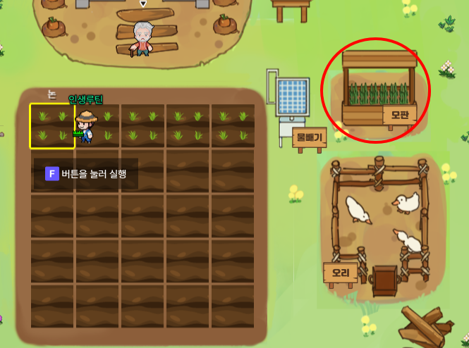 7. 화면 오른쪽의 모판으로 가서 F를 누르고 논으로 가져와서 F를 눌러 모판을 심어주세요