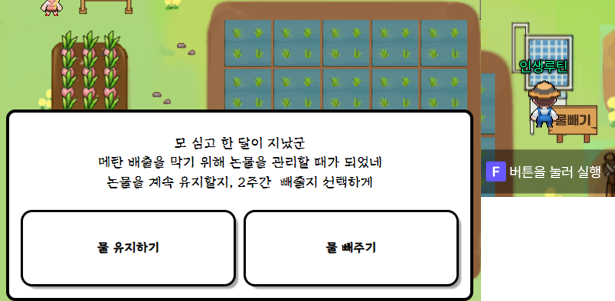 8. 10초를 기다린 후 논 아무곳에서 F를 눌러 물 뺴주기를 선택해주세요