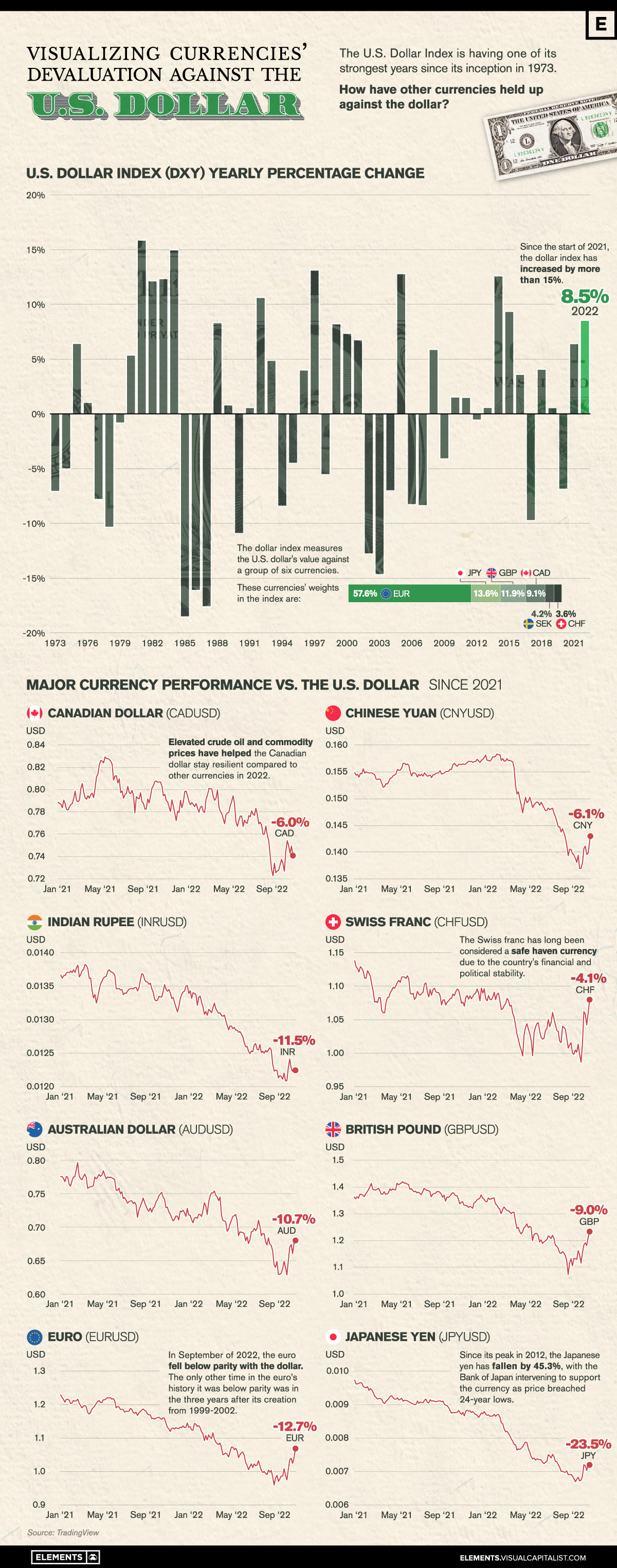 이 그래픽은 TradingView 의 가격 데이터를 사용하여 지난 2년 동안 미국 달러에 대한 주요 통화의 하락과 함께 거의 50년 간의 달러 인덱스 수익률을 시각화합니다.