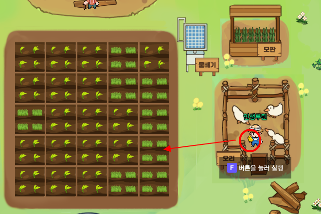 7. 화면 오른쪽의 모판으로 가서 F를 누르고 논으로 가져와서 F를 눌러 모판을 심어주세요