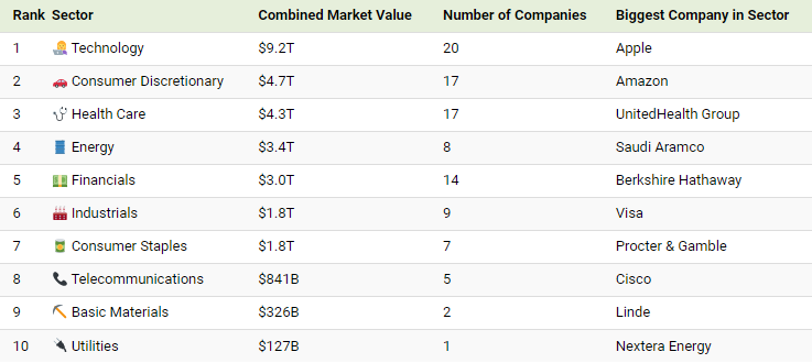 세계에서 가장 큰 회사 중 20개가 기술 분야에 있으며, 총 시장 가치는 9조 2천억 달러입니다.