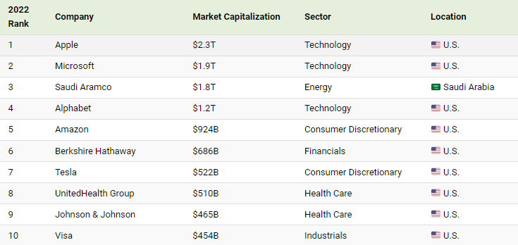 아래에서 볼 수 있듯이 이제 1조 달러 이상의 시가 총액 클럽의 회사는 단 4개뿐입니다.