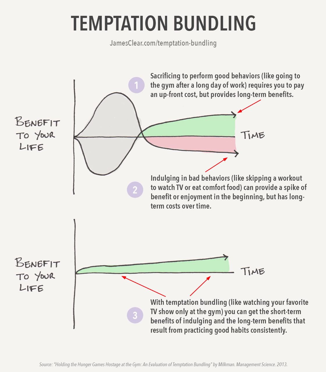 유혹 묶음(체육관에서만 좋아하는 TV 쇼를 시청하는 것과 같은)을 통해 탐닉의 단기적 이점과 좋은 습관을 지속적으로 실천함으로써 발생 하는 장기적 이점을 얻을 수 있습니다.